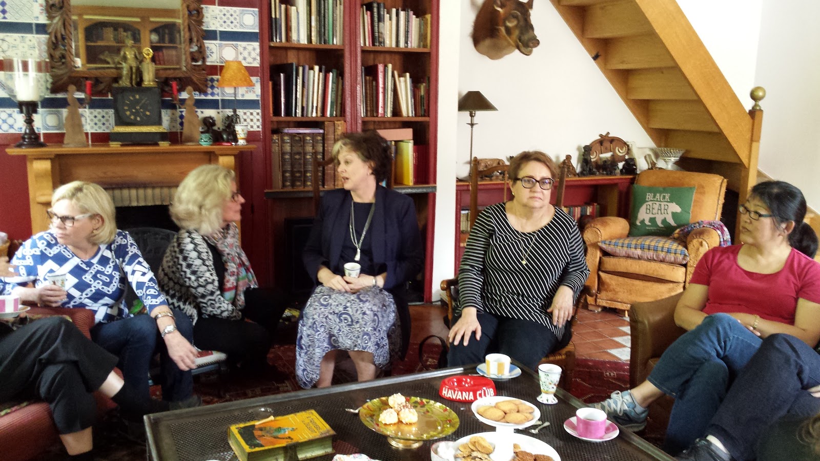 Her house was filled with little curiosities as well as little touches of embroidered items. Cross stitched lamp shades, curtains hemed with cross stitch Sajou patterns and needle point footstools. Unfortunately I didn't feel comfortable photographing someone's house (especially since we were invited), so I only took pictures of the group.