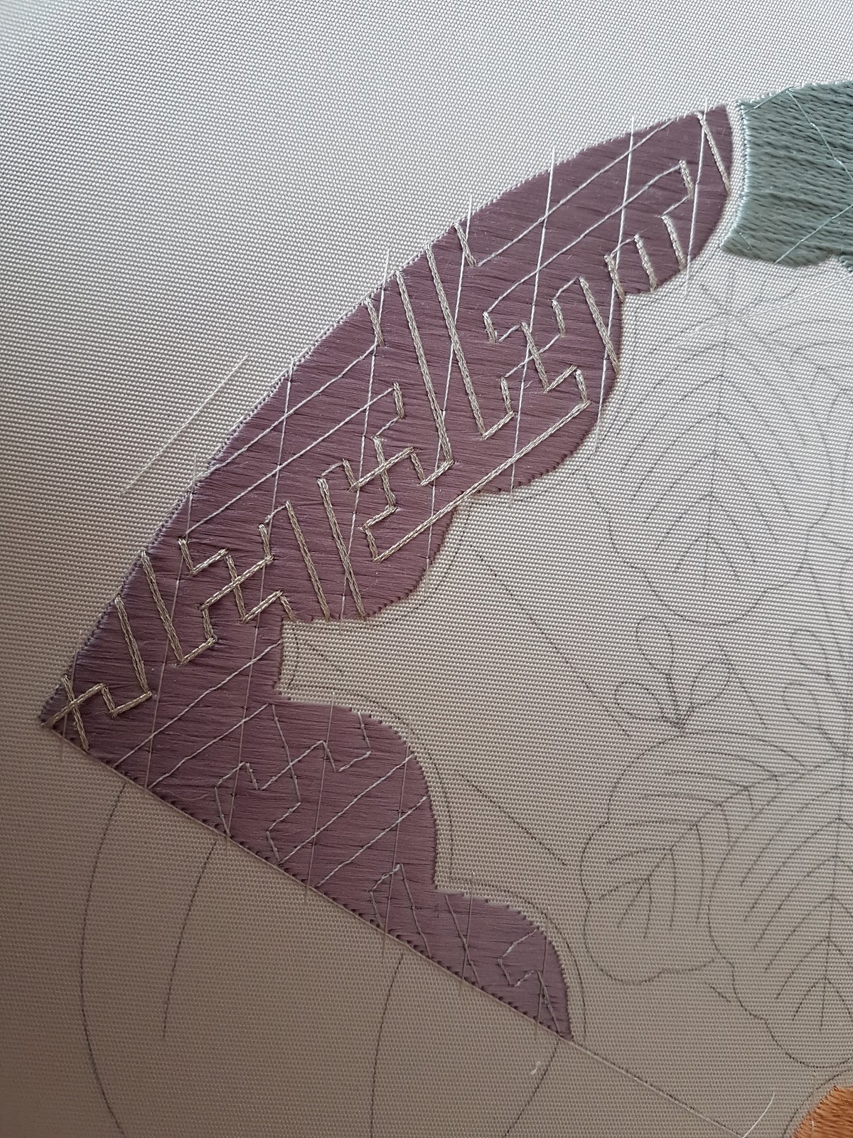 The first element is the woven effect. Towards the end I noticed there was something wrong but it's not very noticeable from afar. I think I might have made a mistake in the third step when we had to tie down the gold thread. Something to improve on for next time.